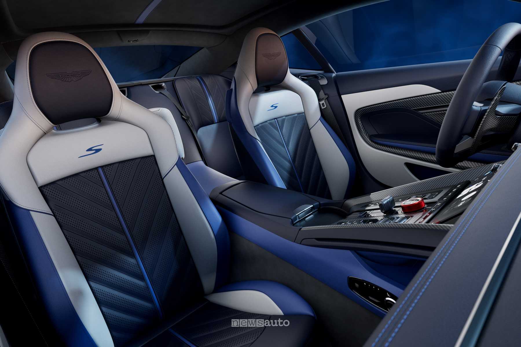 Negli interni l’Aston Martin DB12 S prevede finiture dedicate, come il selettore modalità di guida in rosso anodizzato, ripreso da cinture e cuciture. I sedili Sport Plus elettrici a 16 vie sono di serie, mentre a richiesta ci sono volante in Alcantara riscaldato, sedili Performance in carbonio e varie opzioni di rivestimento.