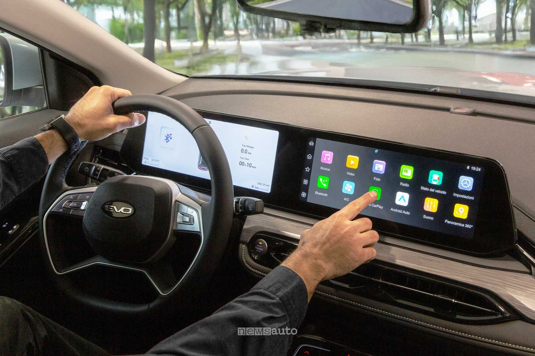 A bordo trovano spazio anche vetri posteriori oscurati, sedili sportivi, climatizzatore automatico e una plancia dominata dal doppio schermo da 12,3 pollici, con connettività wireless per Apple CarPlay e Android Auto.