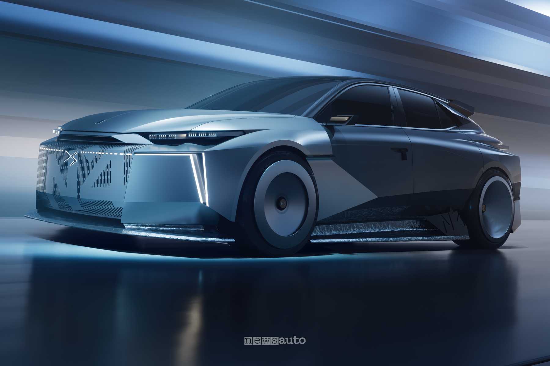 La Taylor Made N°4 Concept deriva dalla DS N°4 ma sembra quasi una vettura completamente nuova. Il frontale chiuso e scolpito, i fari Pixel LED e il logo “N°4” centrale conferiscono un look aggressivo e tecnico, mentre la silhouette ribassata e le carreggiate più larghe richiamano le forme delle monoposto di Formula E.