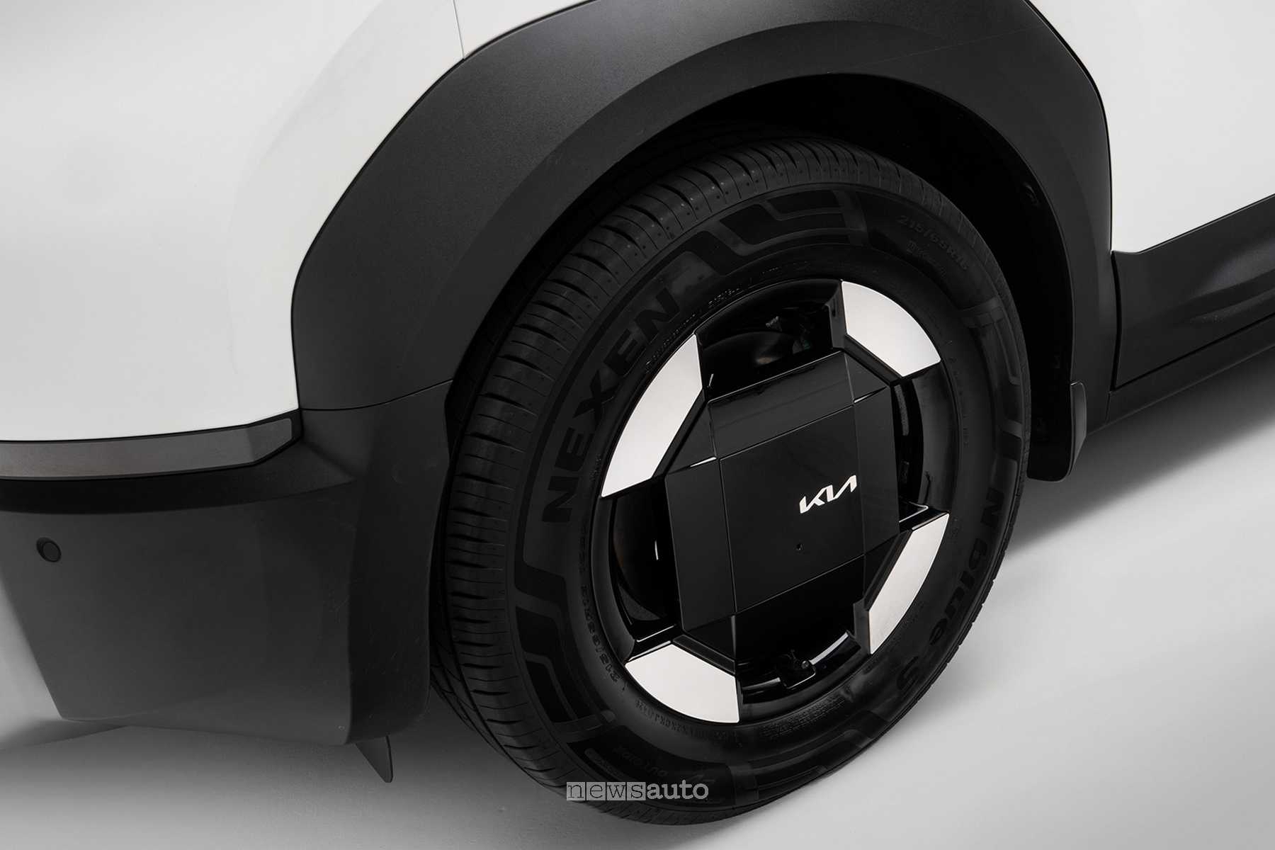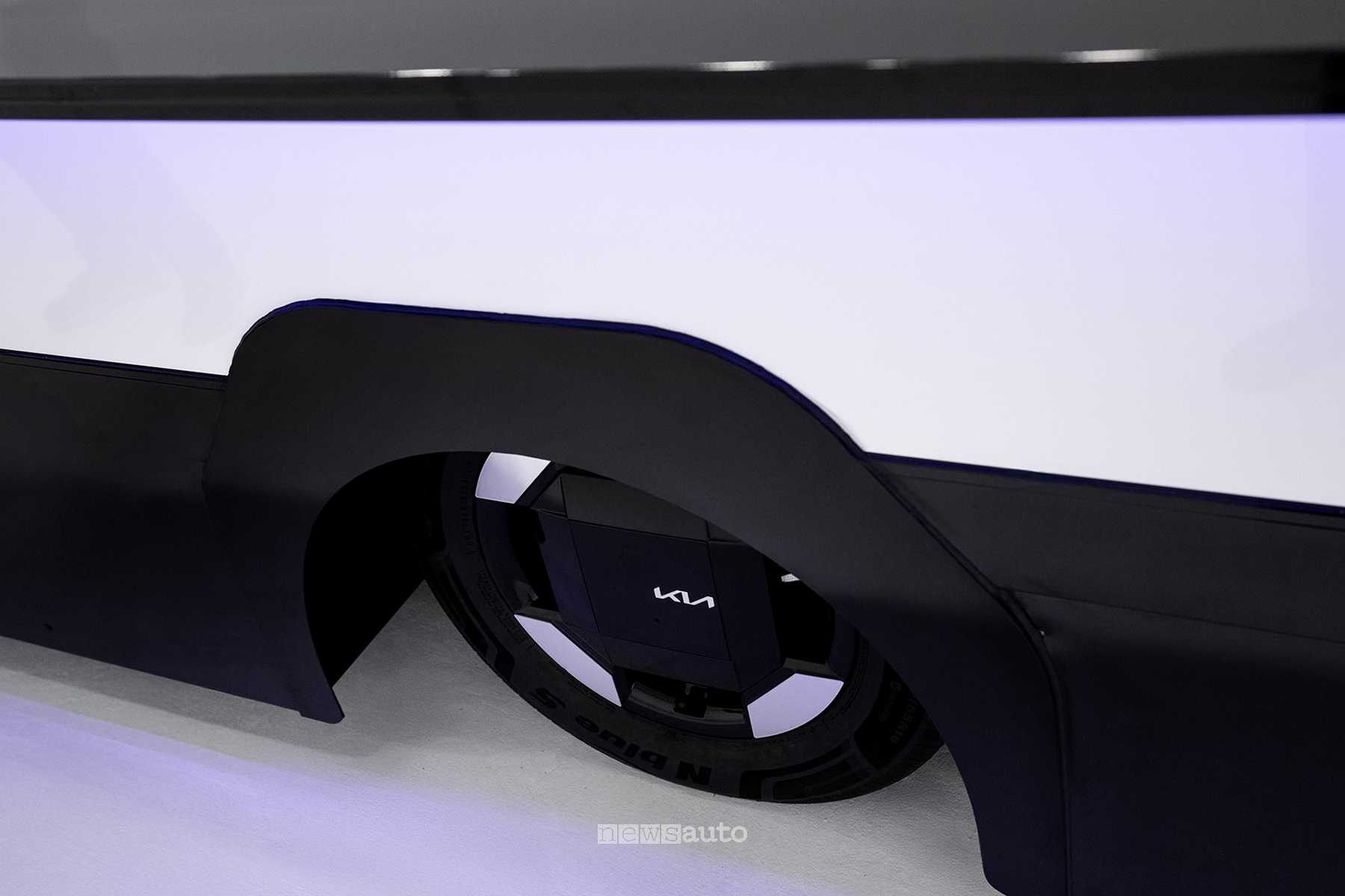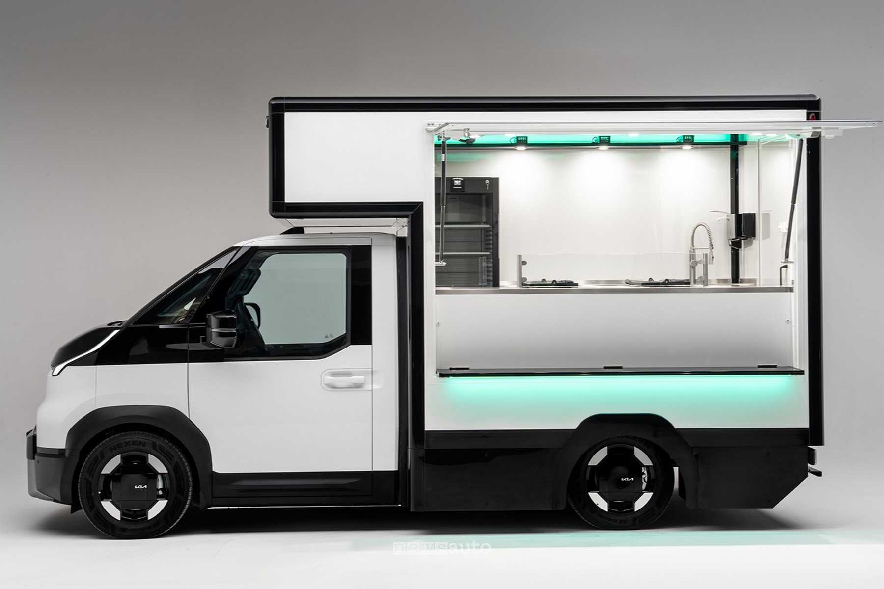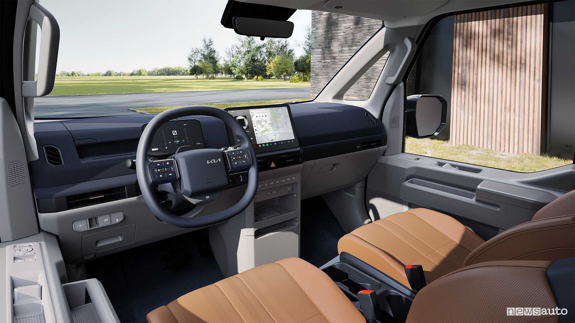 I furgoni elettrici Kia fuori presentano un design futuristico con linee nette superiori e base robusta, illuminazione integrata nei montanti e dettagli neri geometrici su passaruota e sottoporta. Il paraurti inferiore con angoli intercambiabili unisce estetica e funzionalità, secondo la filosofia “Opposites United” di Kia.