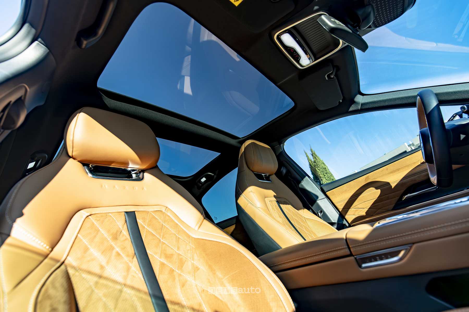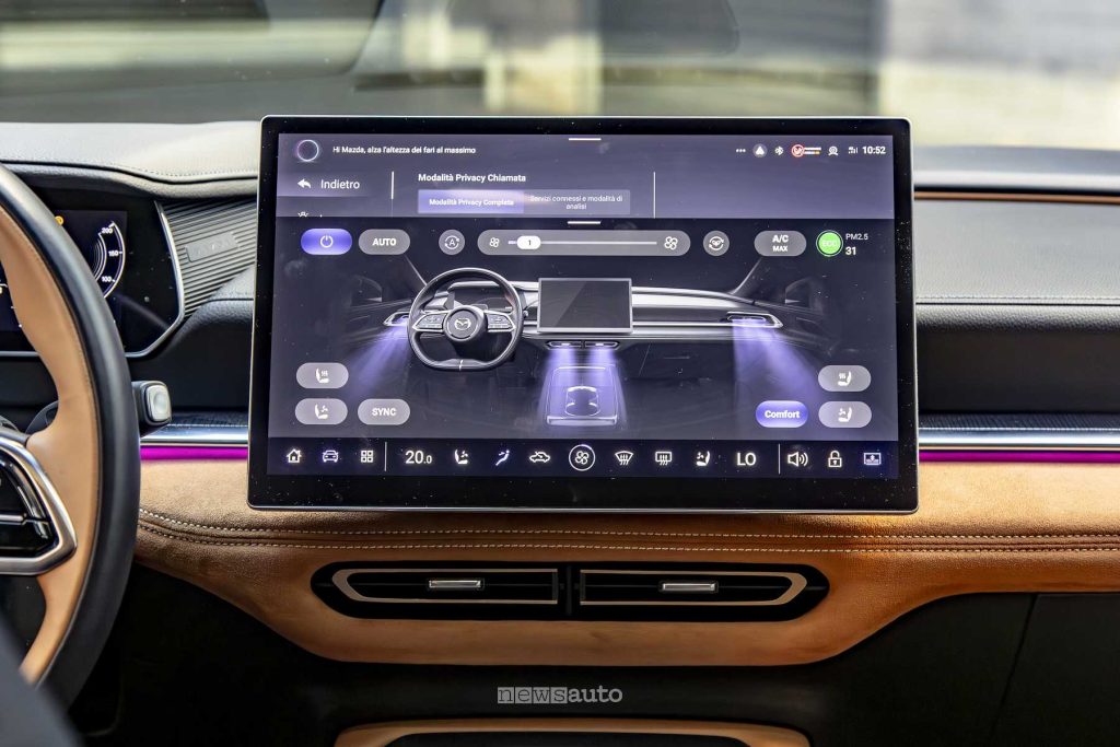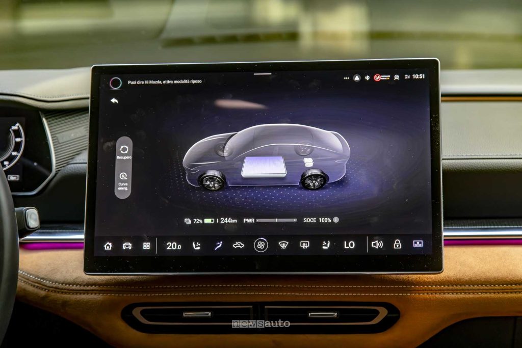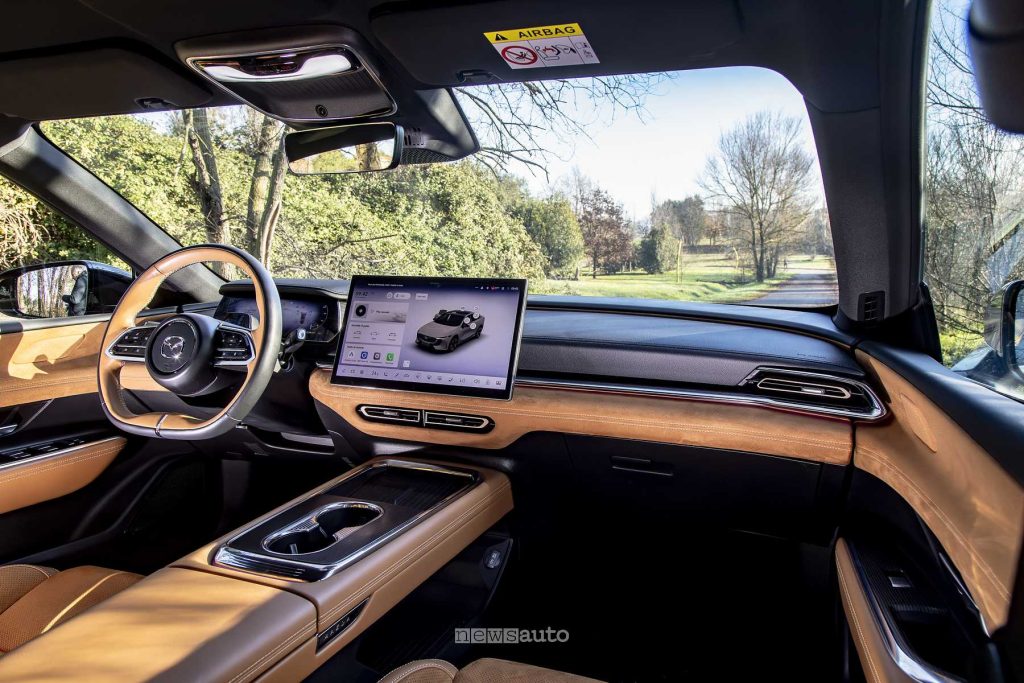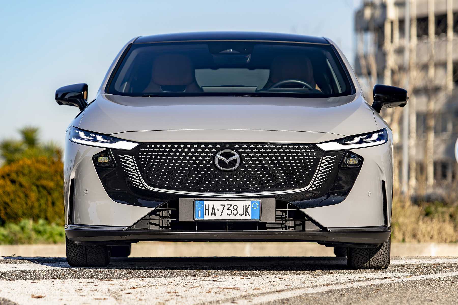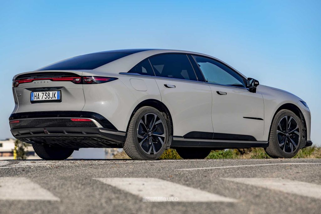 La Mazda6e è una hatchback-coupé a cinque porte lunga quasi 5 metri, con un bagagliaio da 330 litri affiancato da un pratico vano anteriore. L’abitacolo è ampio, luminoso e rifinito con cura, ispirato alla filosofia giapponese del “ma”, con materiali di qualità, tetto panoramico e un’impostazione minimalista ma tecnologica. Non mancano head-up display in realtà aumentata, grande touchscreen centrale, comandi vocali e gestuali, infotainment evoluto e numerose modalità intelligenti pensate per il comfort quotidiano.