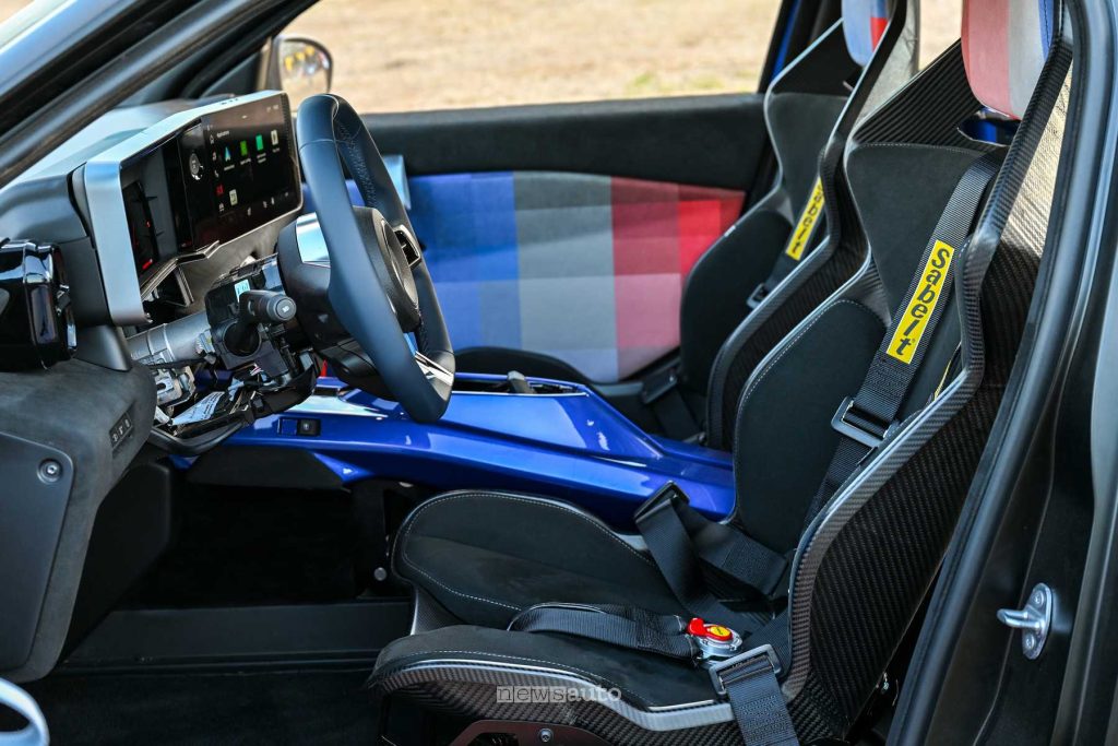 L’abitacolo della Renault 5 Turbo 3E è sportivo e tecnologico, con sedili avvolgenti, cinture a 6 punti, materiali leggeri, freno a mano verticale in stile rally e display OpenR da 10,1” e 10,25” con Google integrato per navigazione, multimedialità e gestione della ricarica.