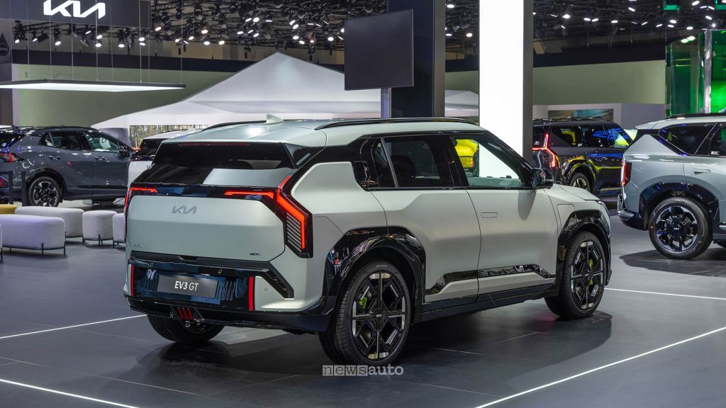 EV3 GT: Il SUV compatto guadagna un assetto più aggressivo, cerchi da 20 pollici e proporzioni verticali che enfatizzano la stabilità.