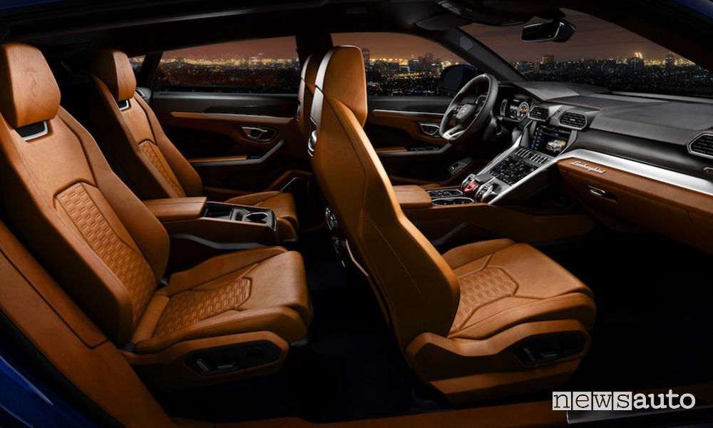 All’interno della Lamborghini Urus balza subito all’occhio il lusso dell’artigianalità italiana, insieme alle sue tecnologie all’avanguardia. Il design è di ispirazione aeronautica mentre il concept “driver-oriented” della strumentazione con tre display TFT (rispettivamente per quadro strumenti, sistema di infotainment e funzioni comfort, compresa la funzione di tastiera virtuale con riconoscimento della scrittura manuale) mette al primo posto le esigenze del guidatore. L’architettura del cruscotto segue il tema della “Y” che si ispira ai modelli iconici di Lamborghini. Gli interni possono essere personalizzati e resi ancora più eleganti o sportivi, grazie all’ampia gamma di colori e materiali: pelle, Alcantara, finiture in legno, alluminio o carbonio, con la possibilità di arricchire ulteriormente alcuni di essi con cuciture a contrasto o Q-citura.