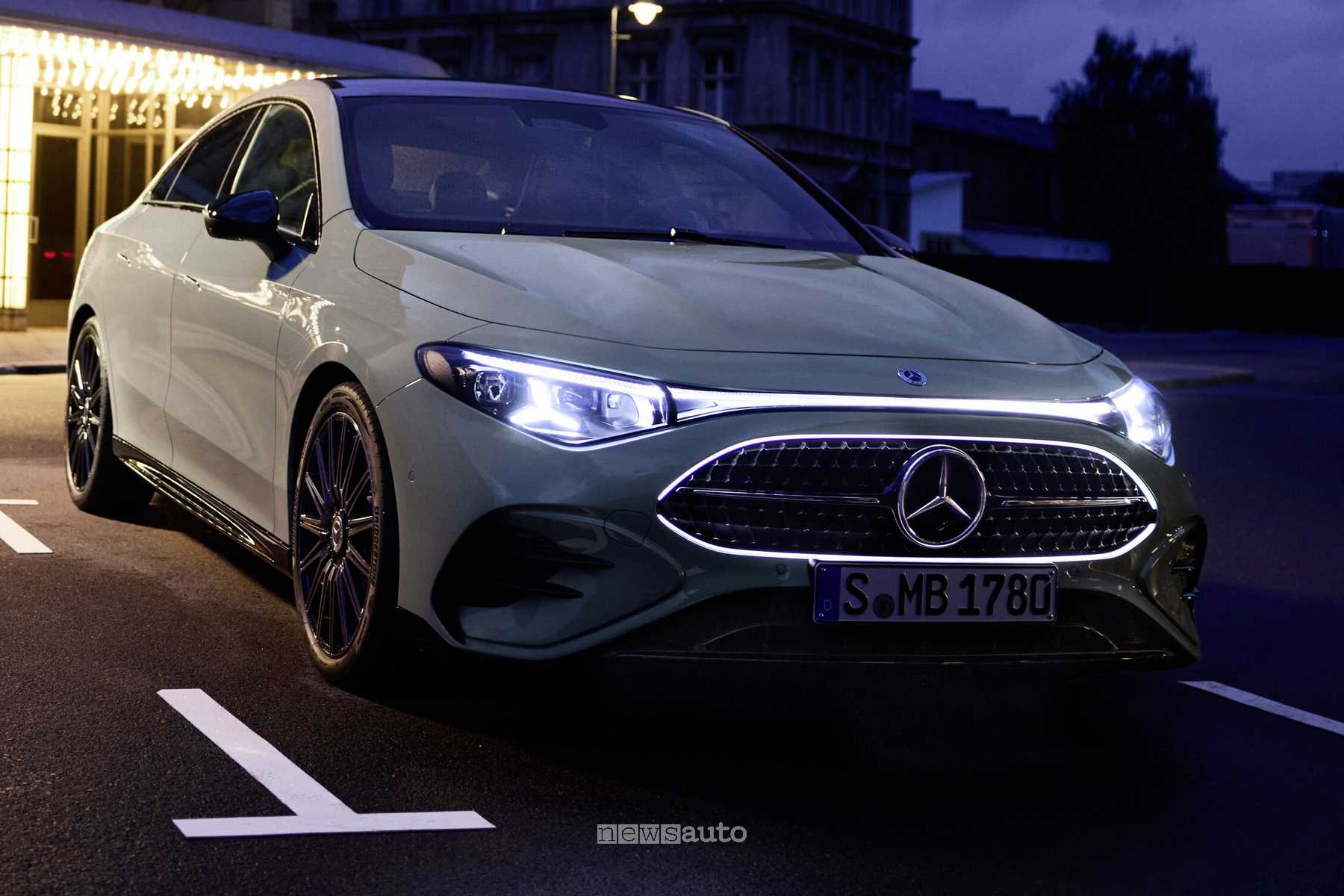 Dal punto di vista estetico, la CLA ibrida mantiene un design simile alla versione elettrica. L’unica differenza evidente riguarda la griglia anteriore tradizionale con la stella Mercedes-Benz al centro e un motivo cromato, affiancata da una cornice luminosa a LED.
