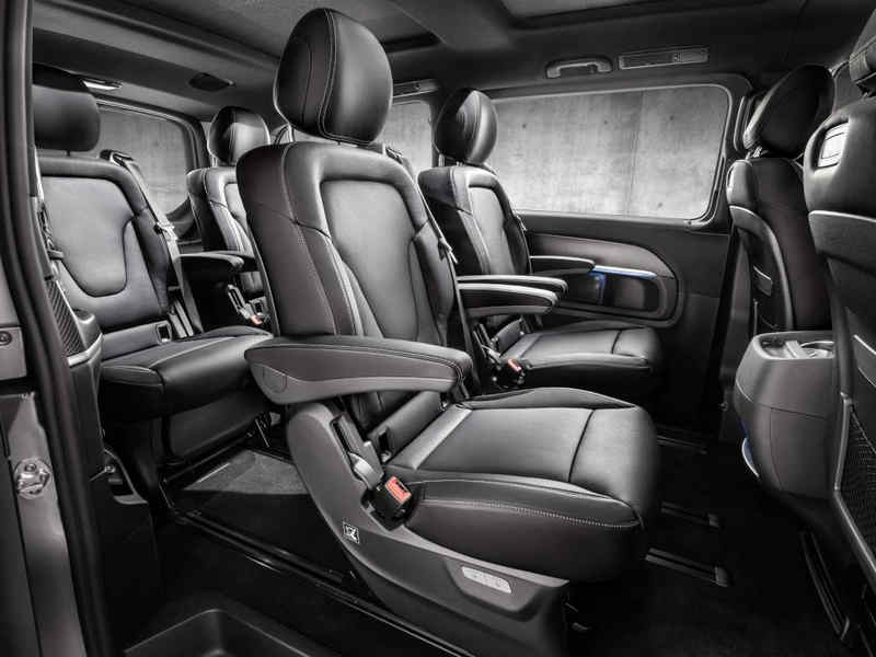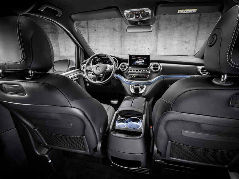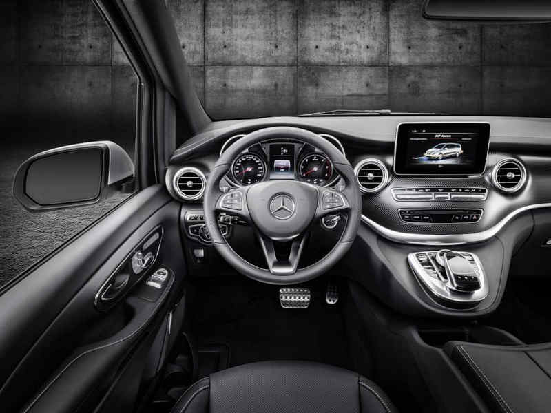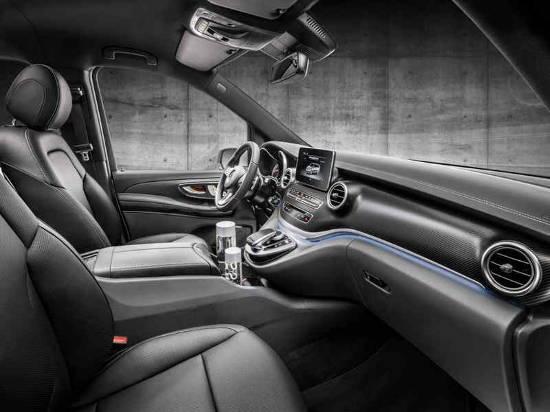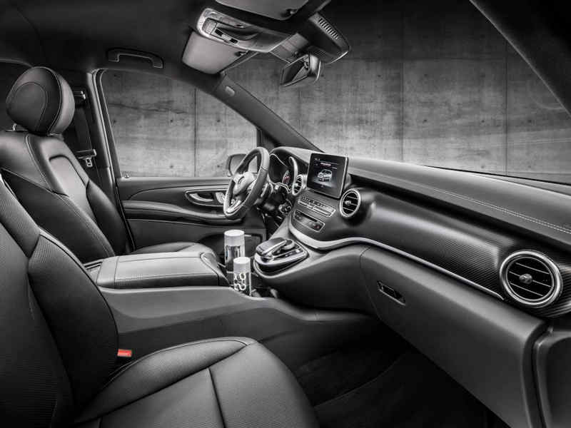 V-Class – Interior, cockpit, AMG Line – air vents in silver chrome, sports pedal cluster, carbon-fibre look trim and black headlining; large centre console with thermo-cupholders and cooler compartment