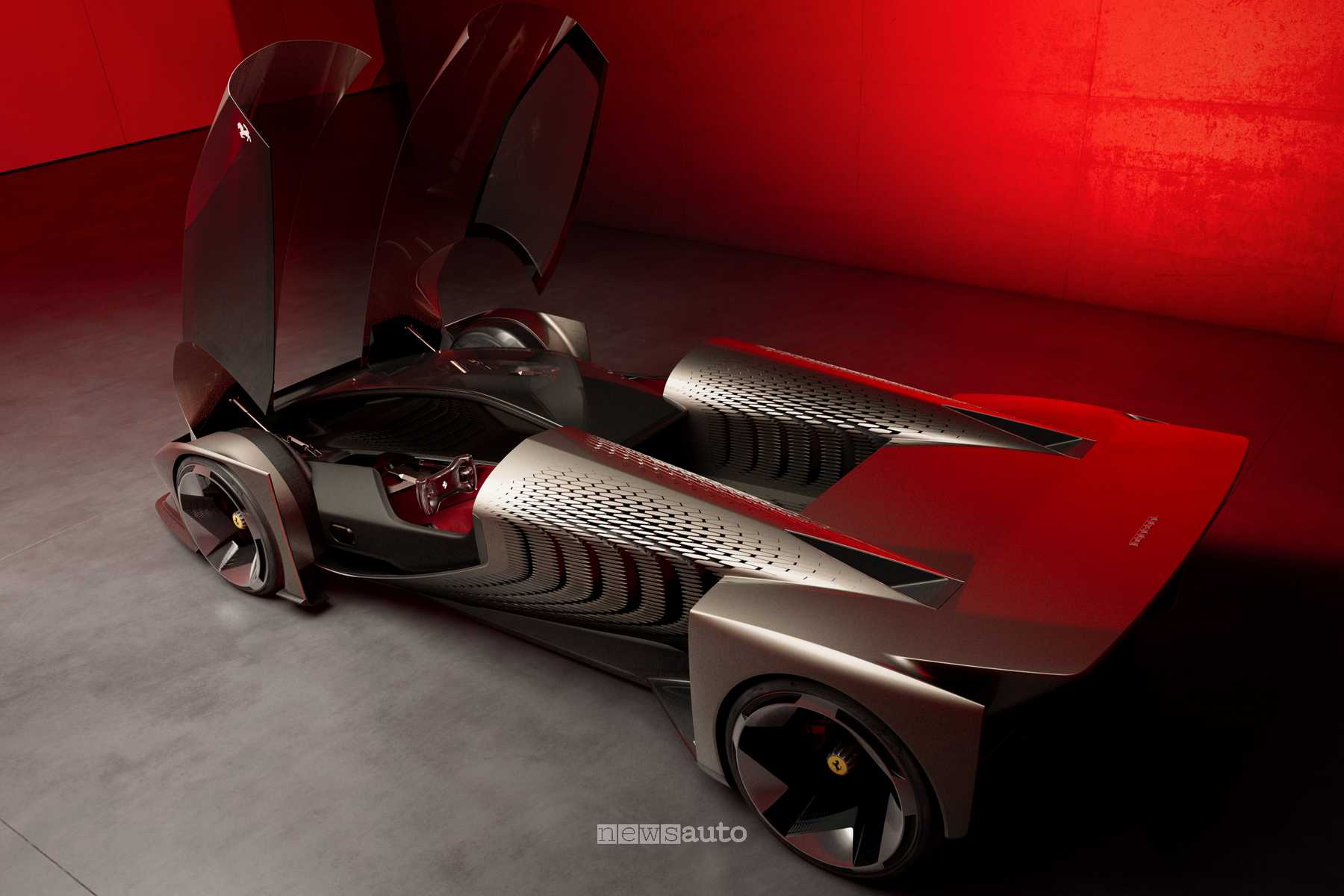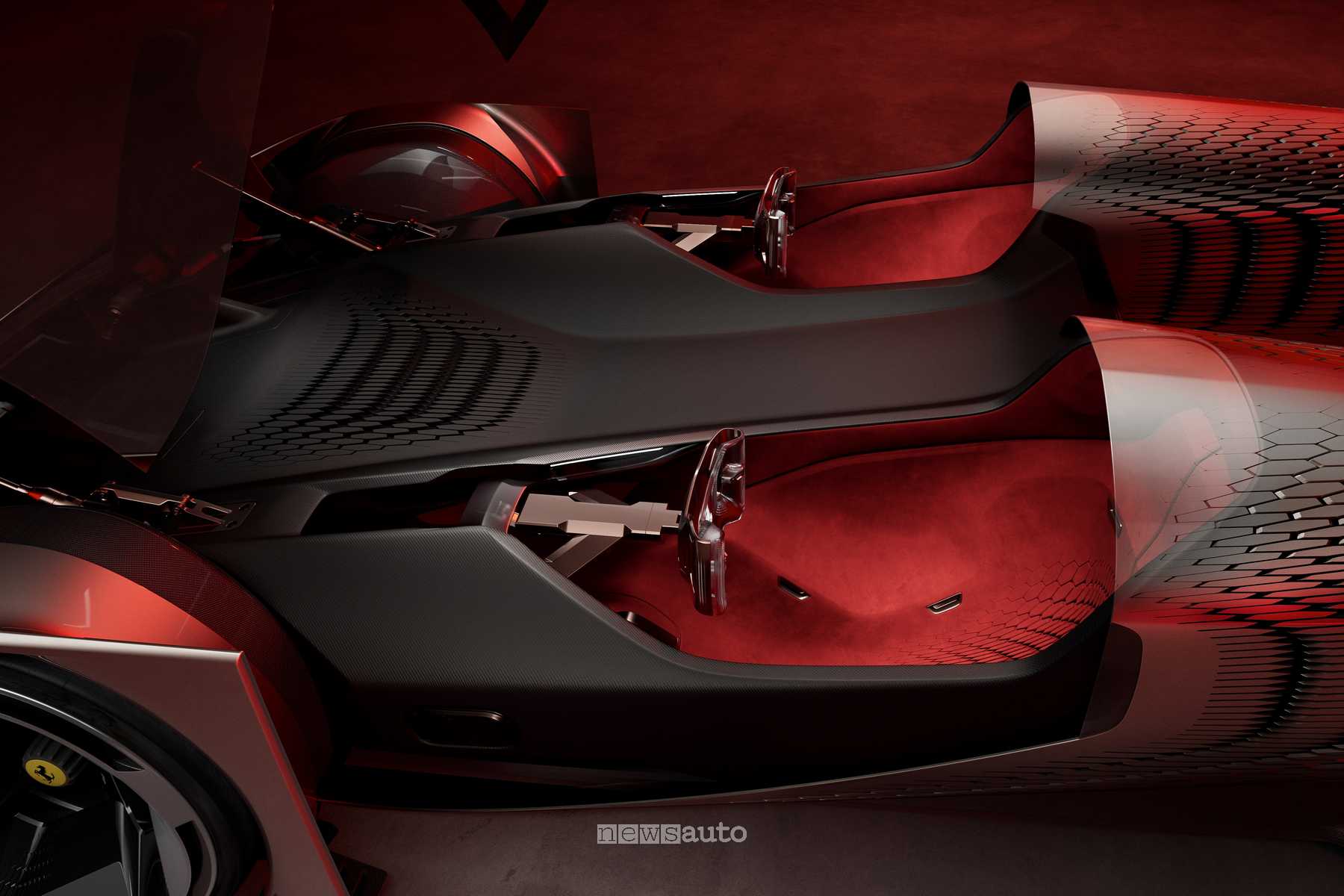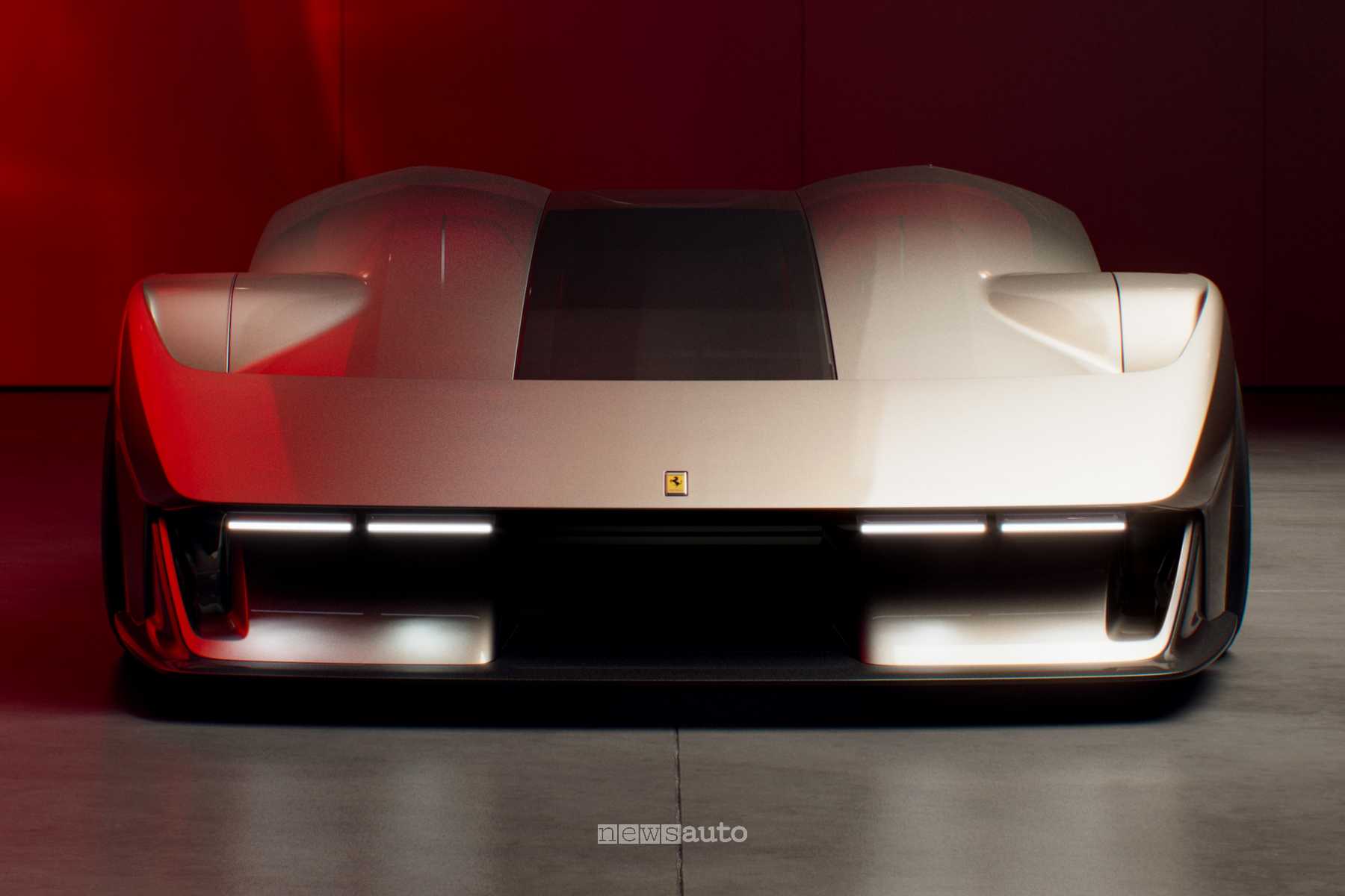 Nel muso, una fascia sospesa tra i parafanghi porta all’estremo il concetto di ala flottante della F80. Le due coppie di fari a scomparsa richiamano i gruppi ottici sollevabili degli anni ’80, mentre i tagli verticali laterali e le branchie tridimensionali evocano lo stile delle Rosse del passato, suggerendo spunti per le hypercar Ferrari del futuro.