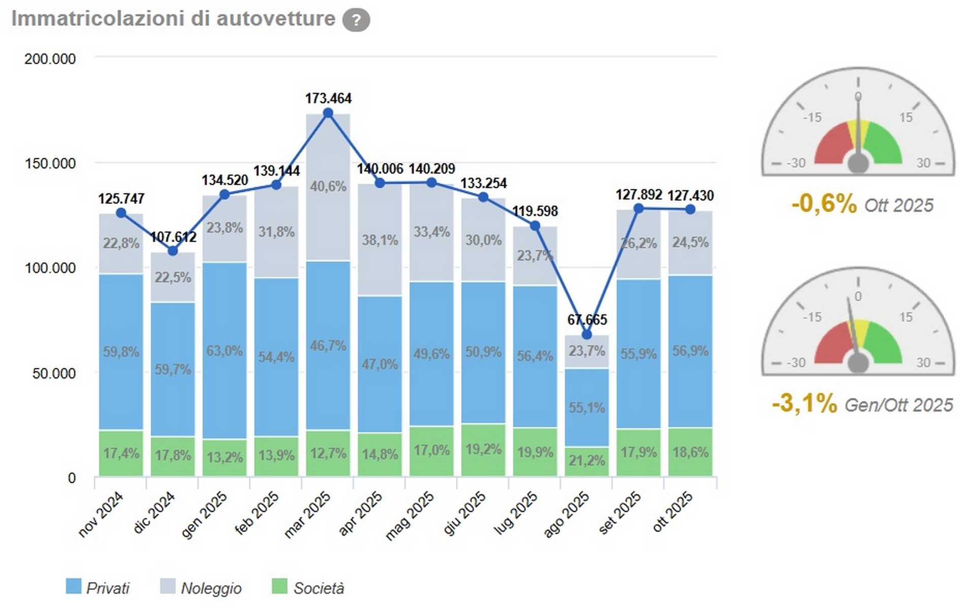 Ad ottobre 2025 il mercato italiano delle autovetture ha registrato 125.826 immatricolazioni, con un calo dello 0,6% rispetto alle 126.543 dello stesso mese del 2024. Negli ultimi tre giorni del mese 2025 è stato immatricolato il 37,12% del totale mercato. Nei primi dieci mesi dell’anno si sono totalizzate 1.293.366 immatricolazioni, segnando una contrazione del 2,7% sullo stesso periodo del 2024 e un calo del 20,4% rispetto al 2019.