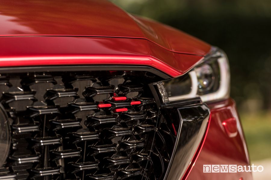 I cerchi in lega da 19″ sono rifiniti in tinta nera metallizzata mentre gli accenti della calandra sono rossi. Sono rosse anche le cuciture sulla pelle nera dei sedili, del volante, della leva del cambio e dei pannelli delle portiere.