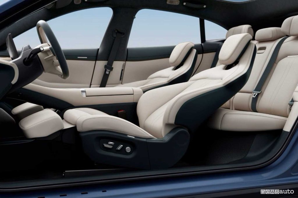 Elemento di spicco è l’HyperVision Panoramic Display: un sottile maxischermo da 1,1 metri alla base del parabrezza, composto da tre display uniti ad alta definizione. Mostra informazioni di guida, media, traffico e indicazioni di navigazione. Nelle versioni top, i sedili sono in pelle Nappa e i passeggeri posteriori hanno a disposizione due schermi sugli schienali anteriori, oltre a un piccolo display centrale per controllare la climatizzazione.