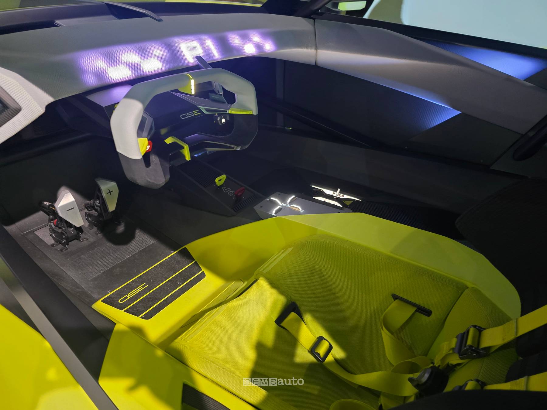 All’interno, l’esperienza è definita “detox”, minimalista e focalizzata sulla guida. Non ci sono schermi superflui: le informazioni essenziali vengono proiettate direttamente sull’head-up display, lasciando la visuale libera. Il pilota è completamente integrato nell’esperienza grazie a un sedile sportivo leggero e integrato al telaio, con cinture di sicurezza a sei punti e un roll-bar di sicurezza. Pedaliera e volante scorrono verso il pilota poiché il sedile è fisso. Inoltre non manca un impianto di estinzione marchiato Sparco.