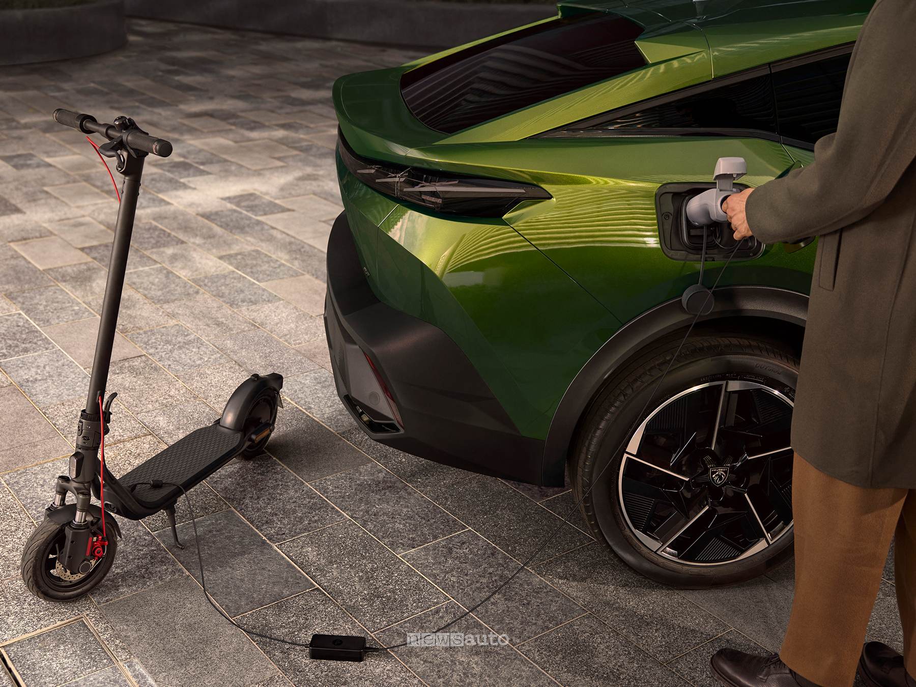 Al posteriore debutta una novità assoluta per il marchio: la scritta Peugeot illuminata, inserita in una fascia luminosa che attraversa tutta la larghezza del veicolo. Il profilo laterale è arricchito dai nuovi cerchi Adakite da 19” con design geometrico (o Monolithe da 20″ su GT Exclusive Plug-in). La carrozzeria introduce la tinta Flare Green, un colore cangiante che varia dal giallo brillante al verde intenso a seconda della luce.