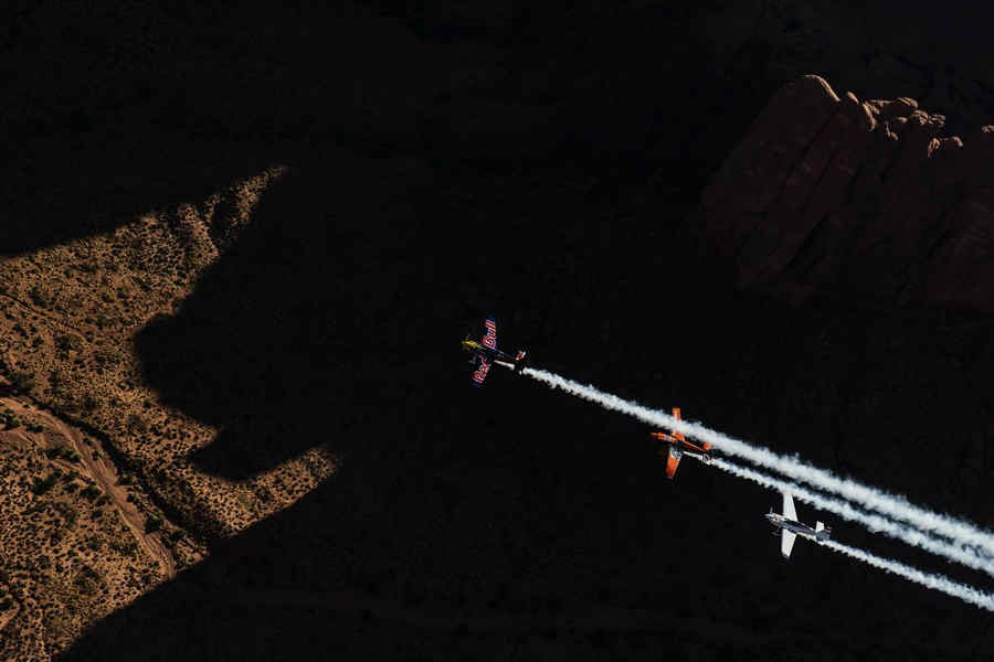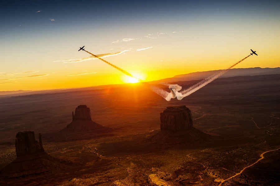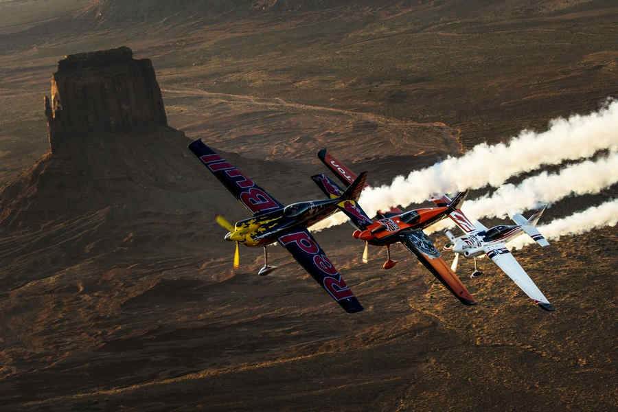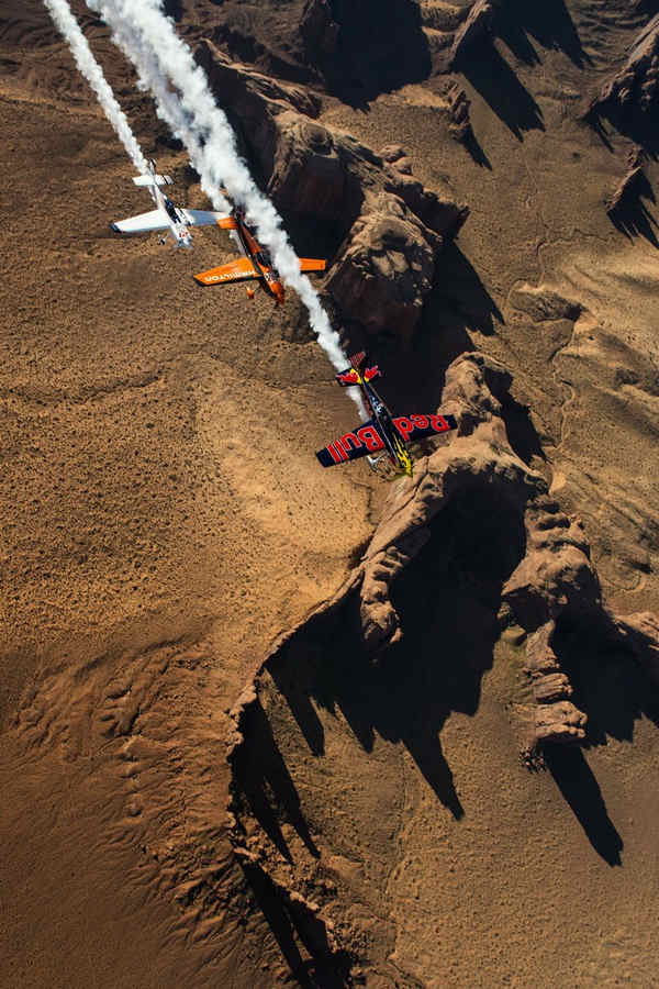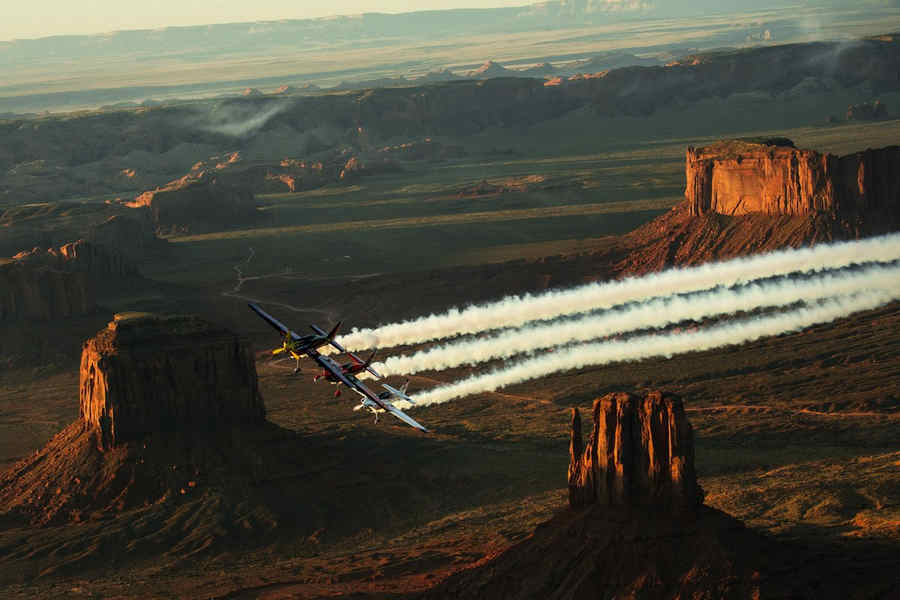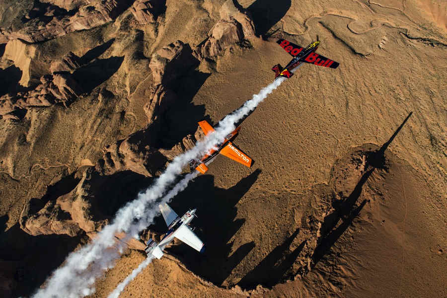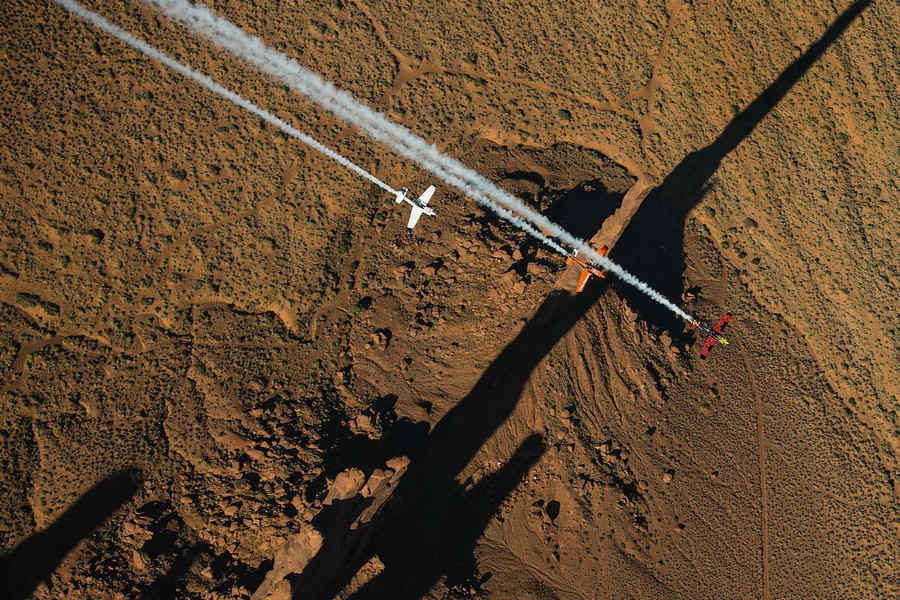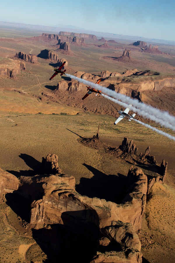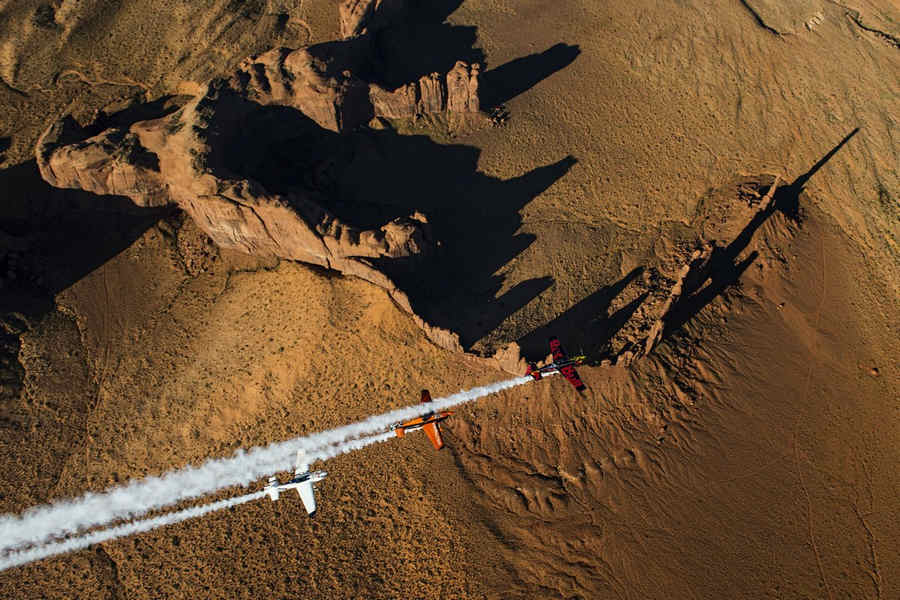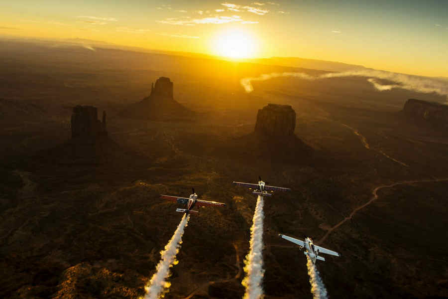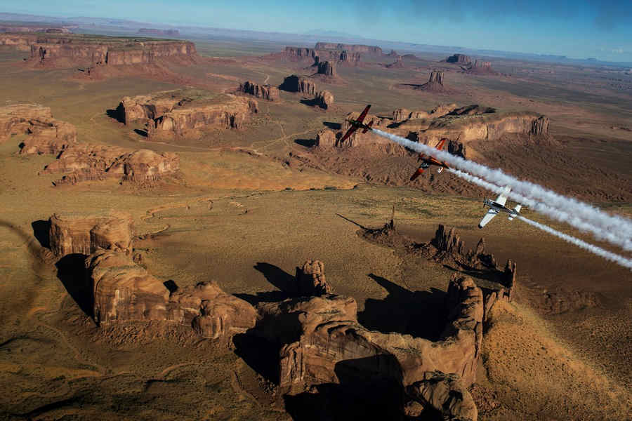 Kirby Chambliss of the United States leads Nicolas Ivanoff of France and Matthias Dolderer of Germany over the Monument Valley Navajo Tribal Park in Utah, United States on September 29, 2015. The pilots are ferrying their race planes to the season final of the Red Bull Air Race World Championship held in Las Veags on October 18.
