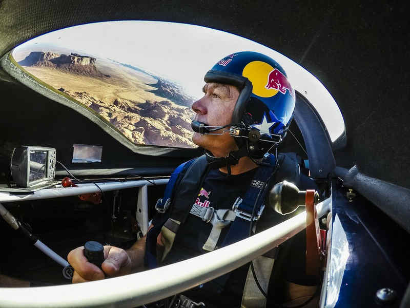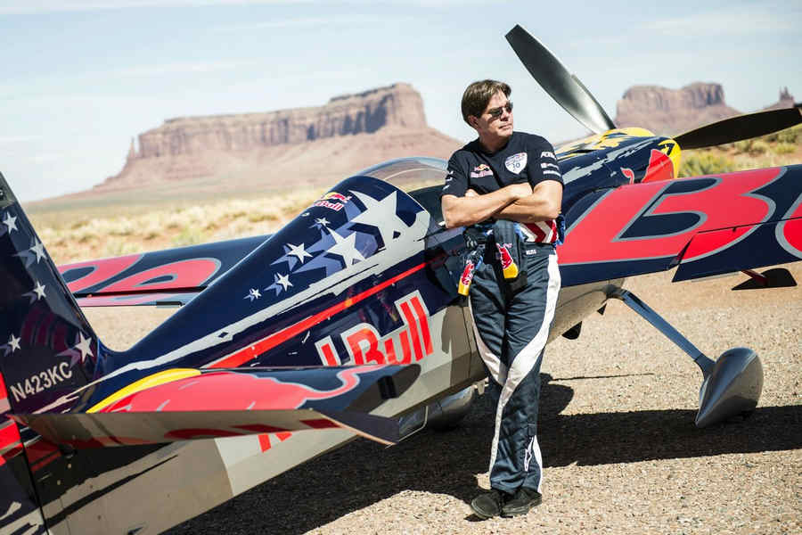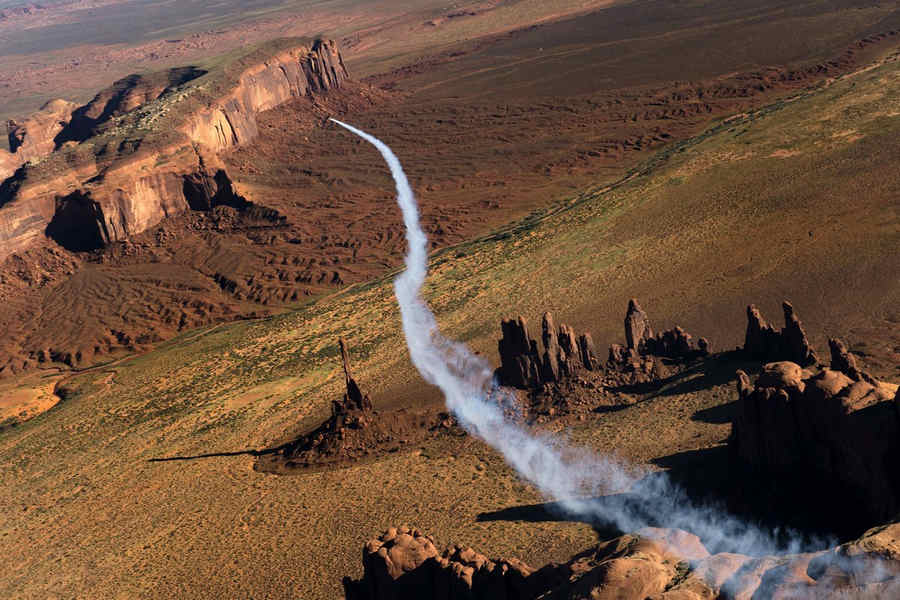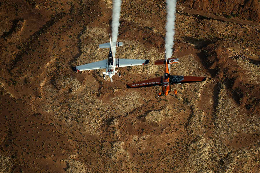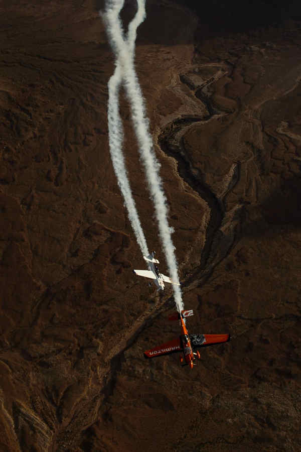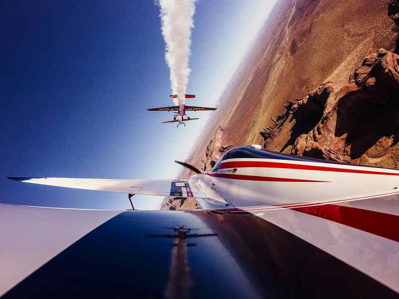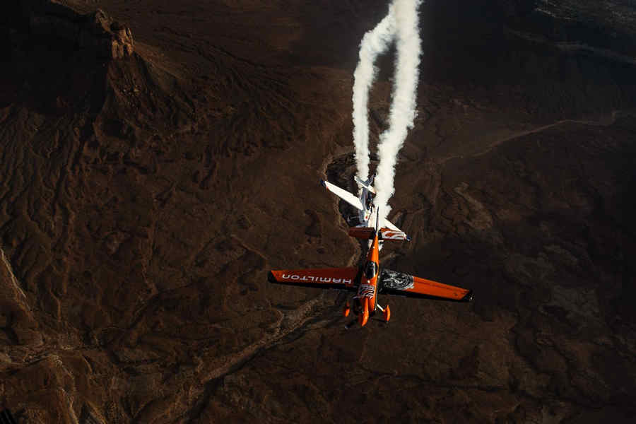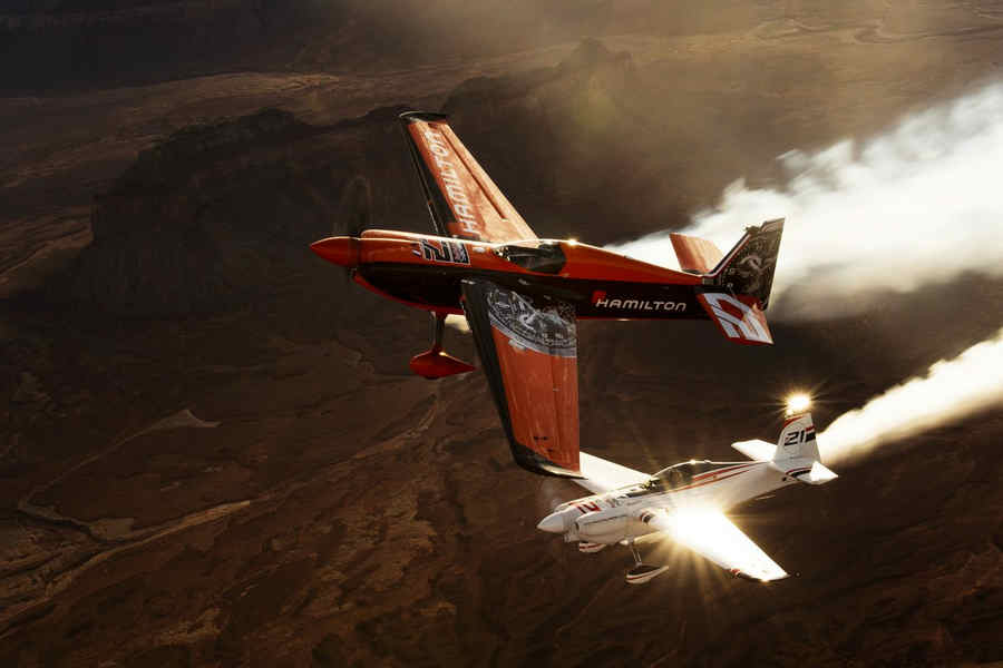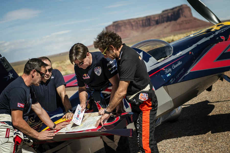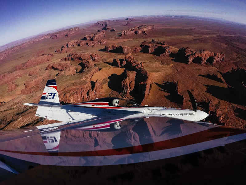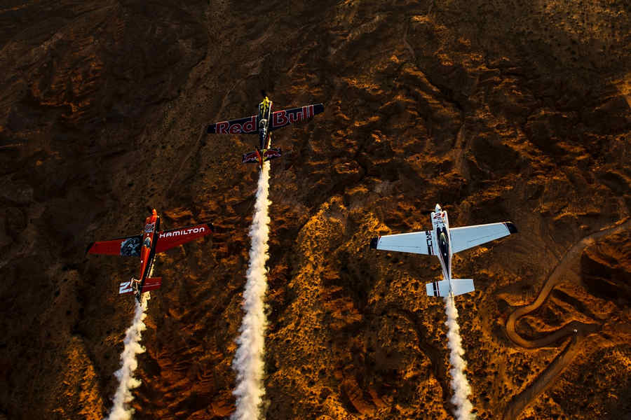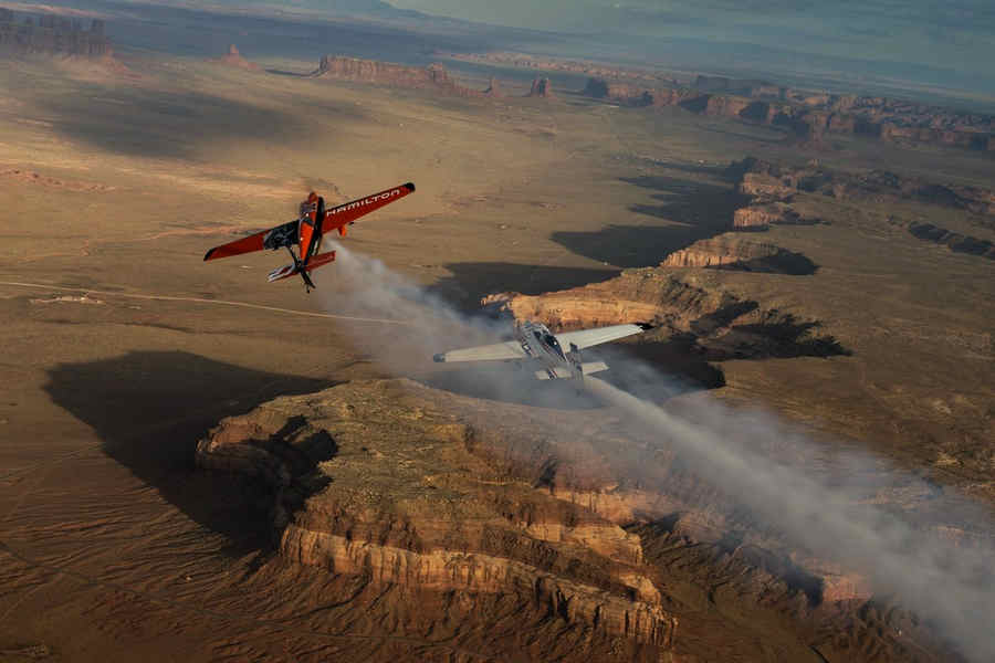 Kirby Chambliss of the United States leads Nicolas Ivanoff of France and Matthias Dolderer of Germany over the Monument Valley Navajo Tribal Park in Utah, United States on September 29, 2015. The pilots are ferrying their race planes to the season final of the Red Bull Air Race World Championship held in Las Veags on October 18.
