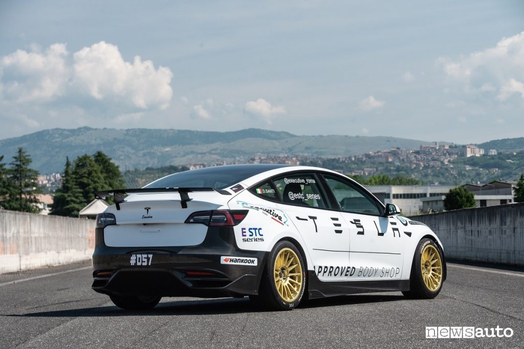 Test in pista della Tesla Model 3 Performante, alleggerita con assetto e freni studiati per partecipare al nuovo campionato E-STC riservato alle auto elettriche da corsa.