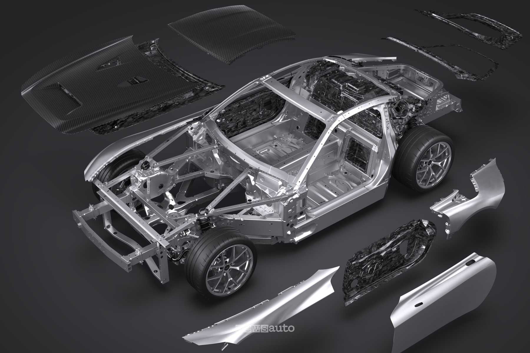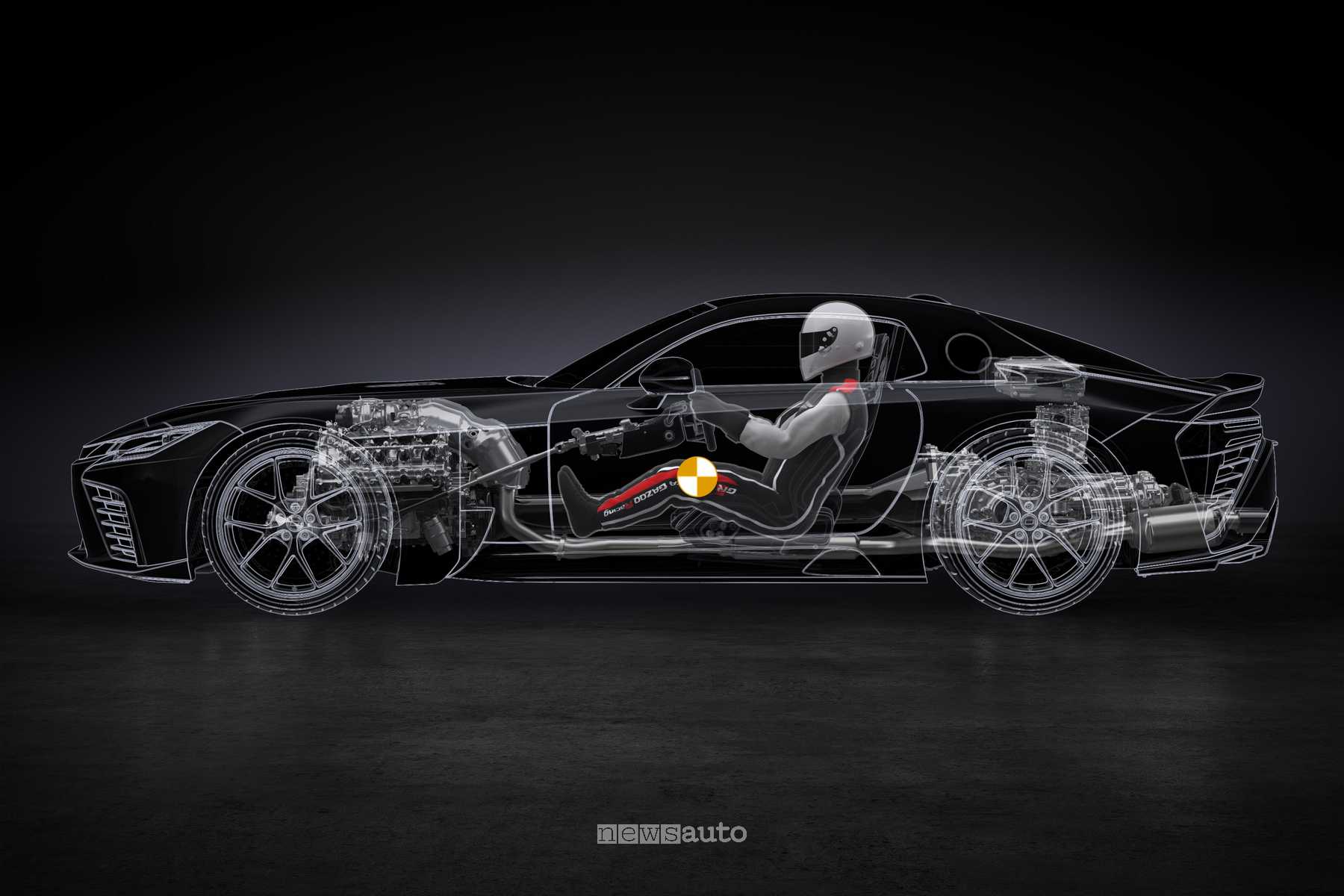 La GR GT utilizza il primo telaio interamente in alluminio sviluppato da Toyota, progettato per combinare peso ridotto ed elevata rigidità grazie a saldature rinforzate e all’uso di pannelli in alluminio e fibra di carbonio.