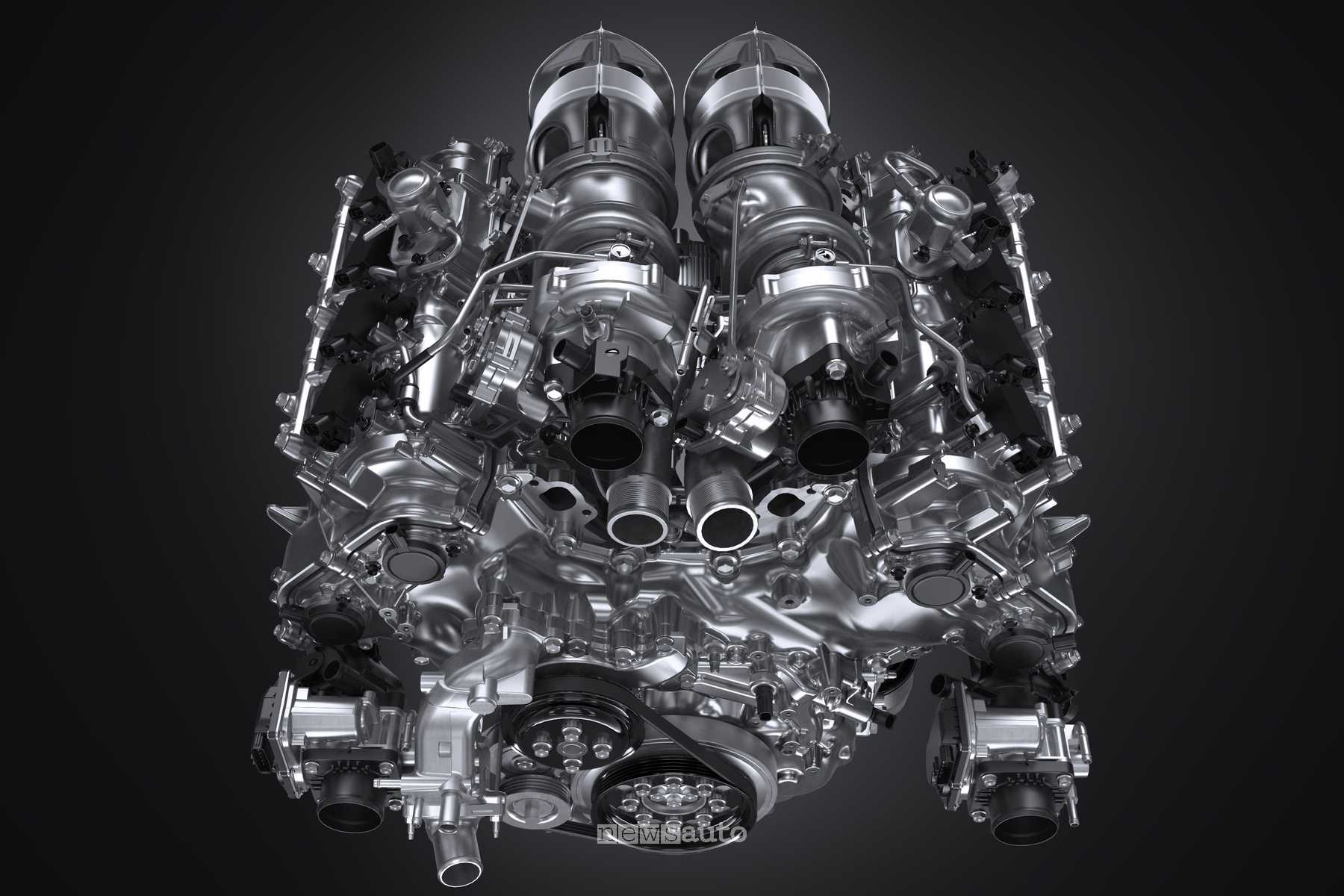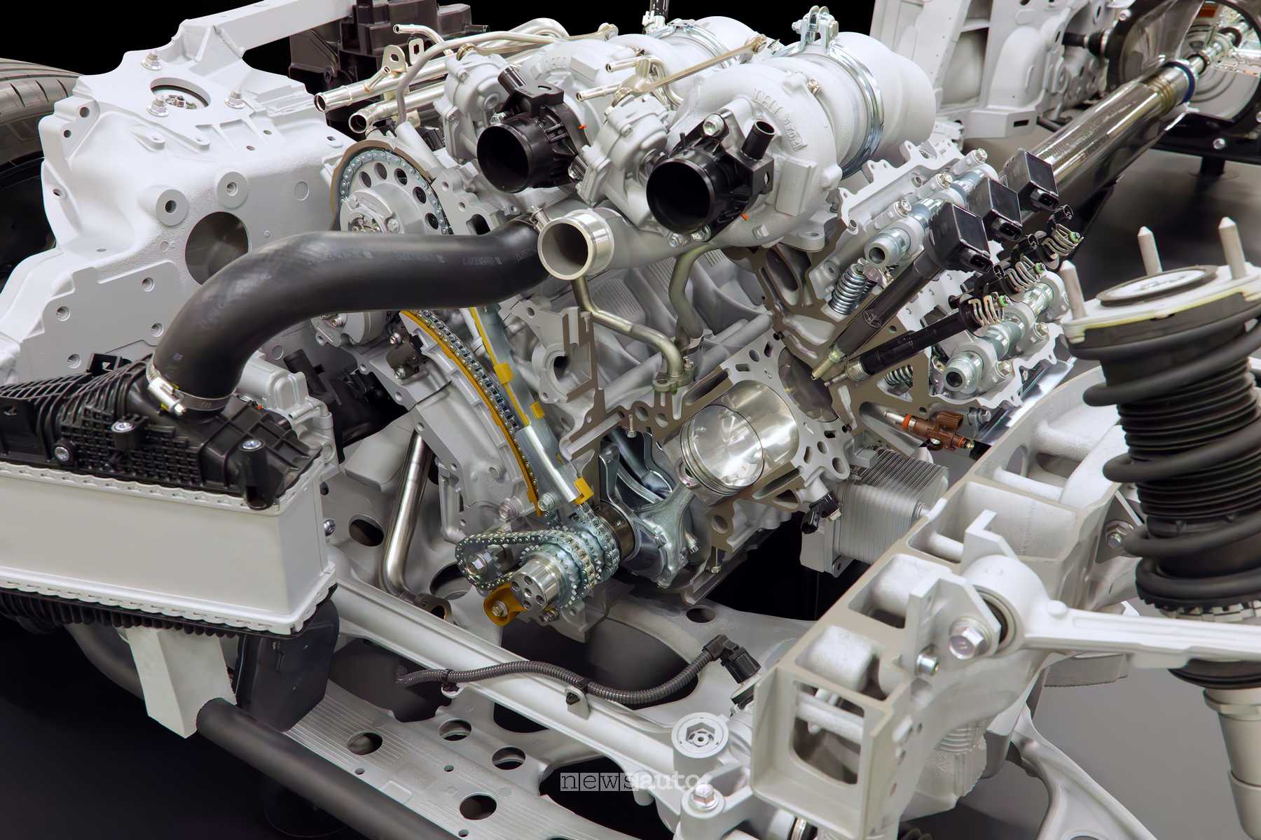 Il motore ha un alesaggio per corsa di 87,5 x 83,1, corsa corta che riduce l’altezza complessiva del motore. La configurazione a V posiziona un turbo in ciascuna bancata. L’unità dispone anche di lubrificazione con carter a secco e di una coppa dell’olio dal design più sottile del solito.