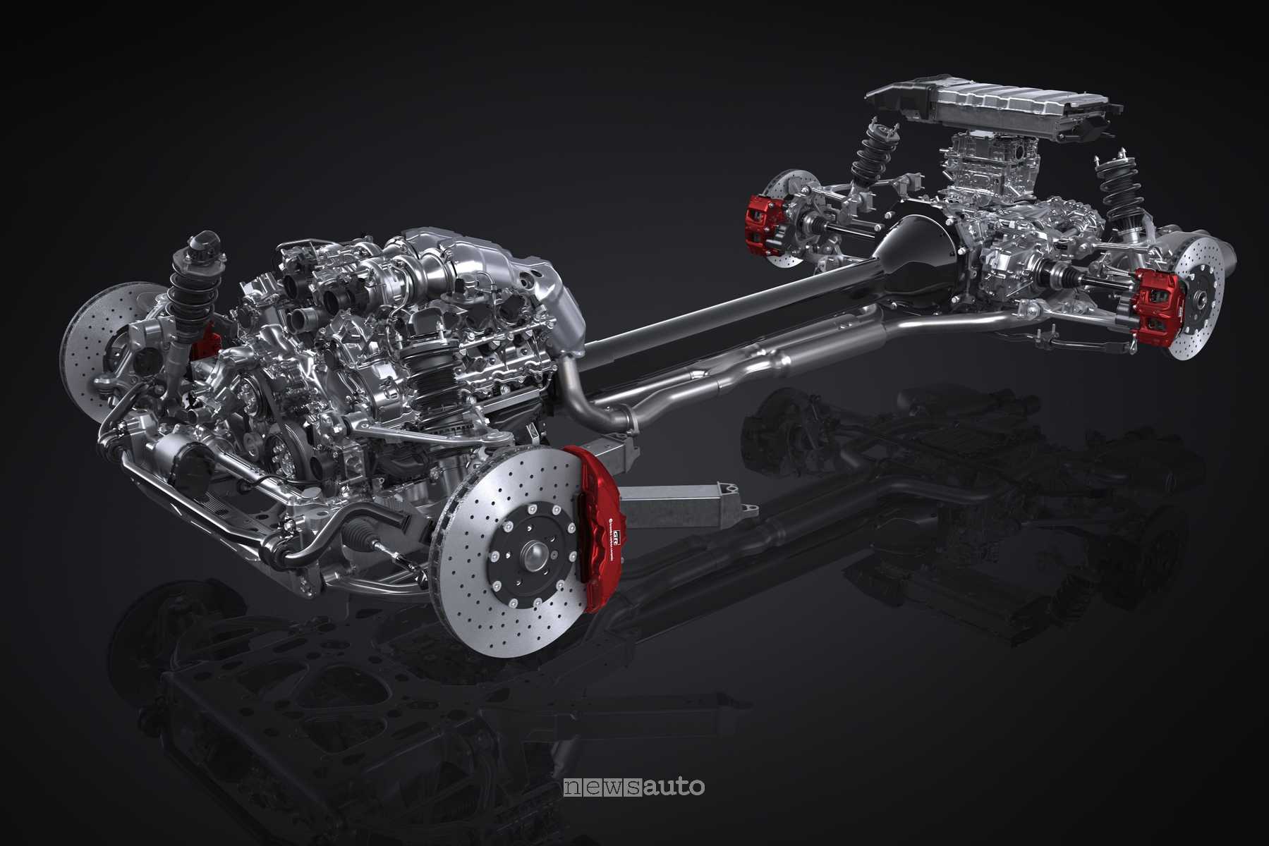 Il gruppo propulsore include anche un motore-generatore e un cambio automatico a otto marce con frizione a bagno d’olio e differenziale meccanico a slittamento limitato. Il motore-generatore serve a compensare i ritardi di coppia in accelerazione e durante i cambi di marcia. La trasmissione posteriore impiega un ingranaggio conico per invertire il moto dell’albero, una soluzione insolita per un’auto a motore anteriore e trazione posteriore. La GR GT3 utilizza una variante dello stesso V8 con numerosi elementi condivisi.