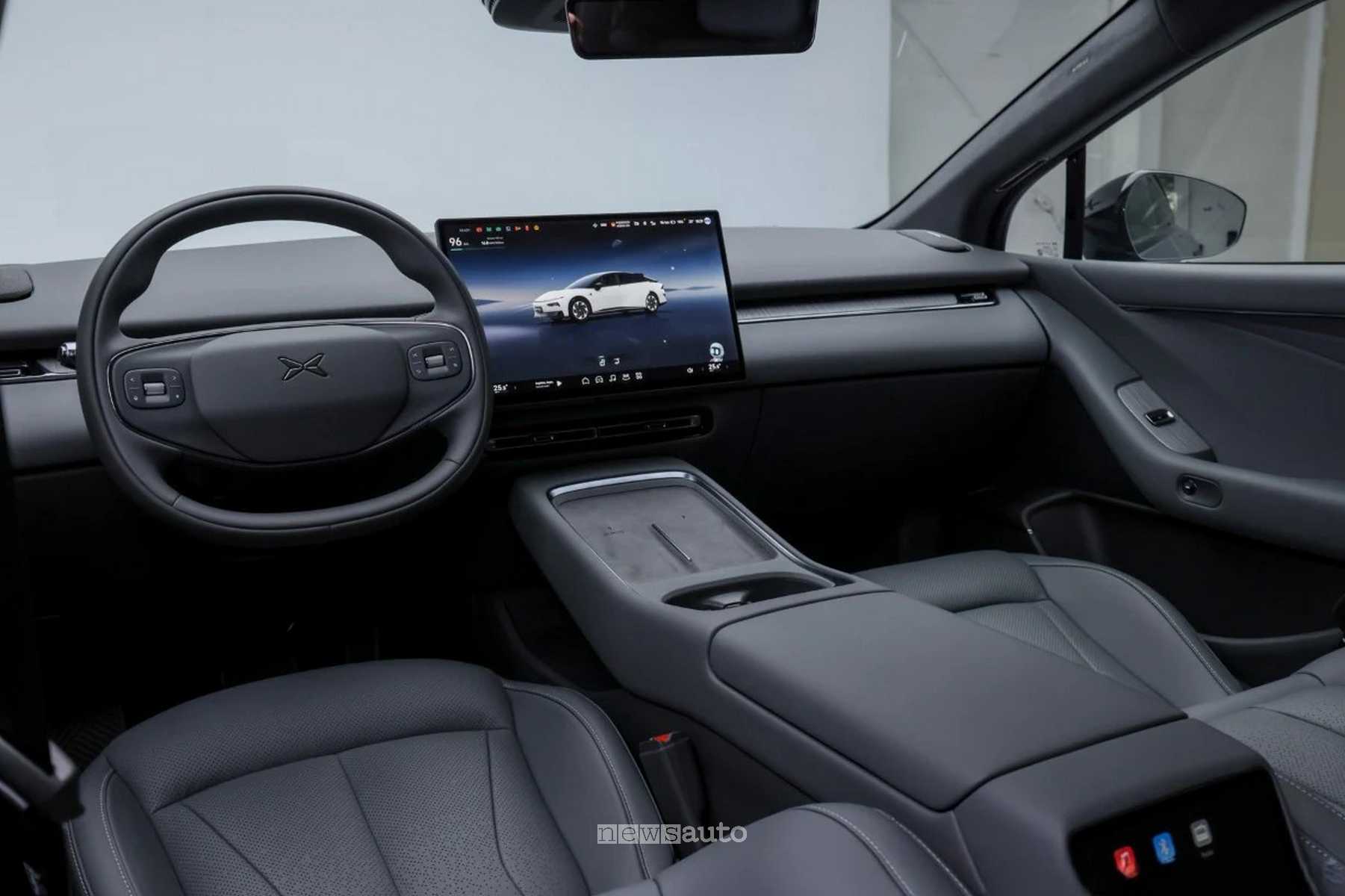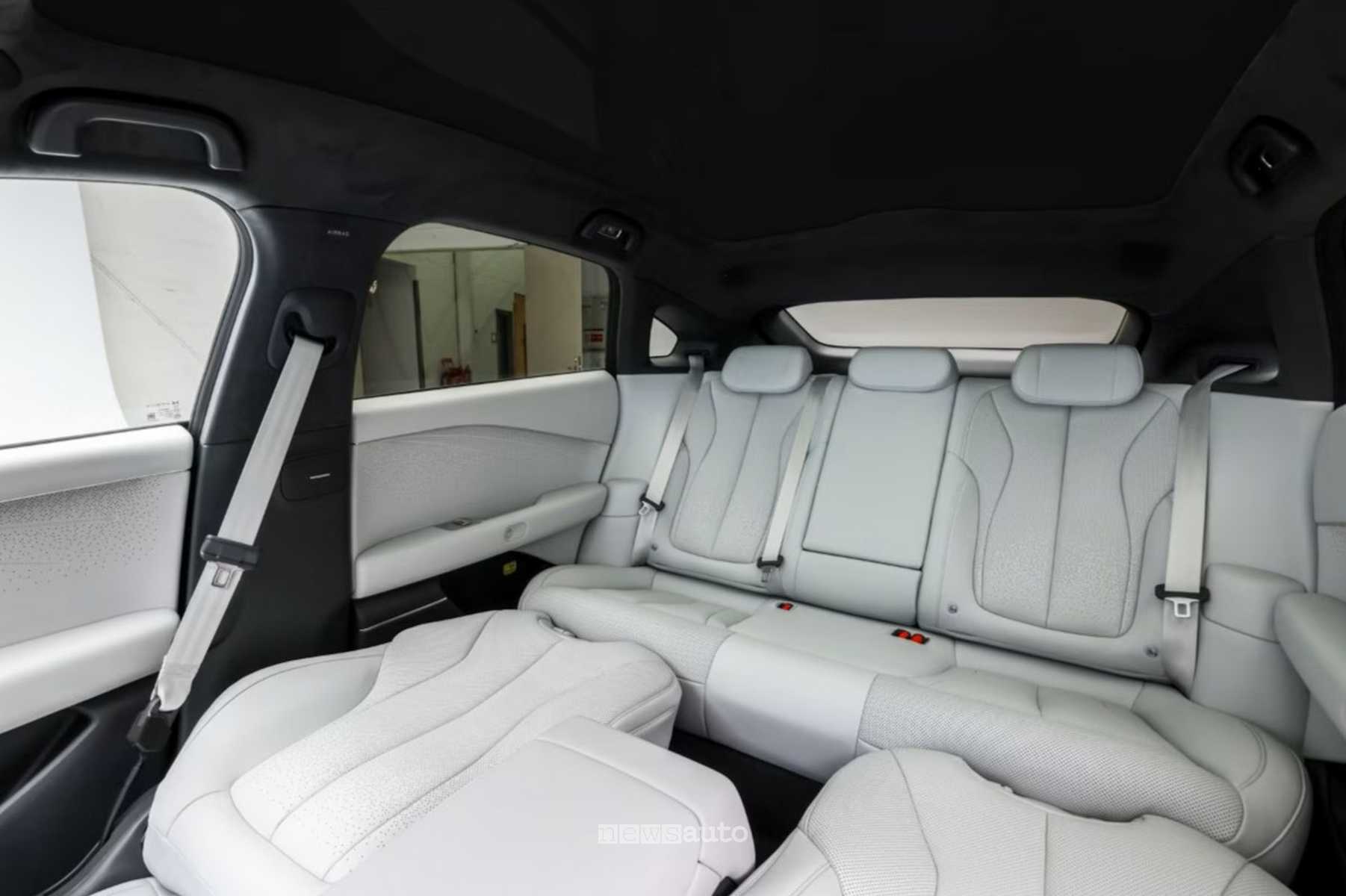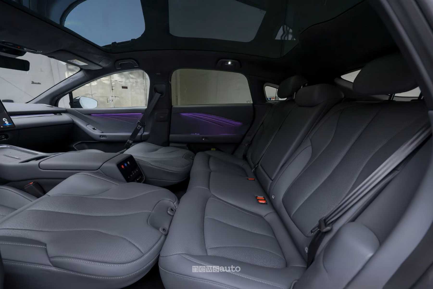 L’abitacolo utilizza materiali morbidi e rigidi assemblati con attenzione e propone una dotazione tecnologica ormai tipica delle berline elettriche di fascia medio-alta: schermo centrale da 15,6 pollici, cruscotto digitale da 8,8 pollici, due display posteriori da 8 pollici, prese USB di tipo A e C su entrambe le file e un impianto audio con 20 altoparlanti.